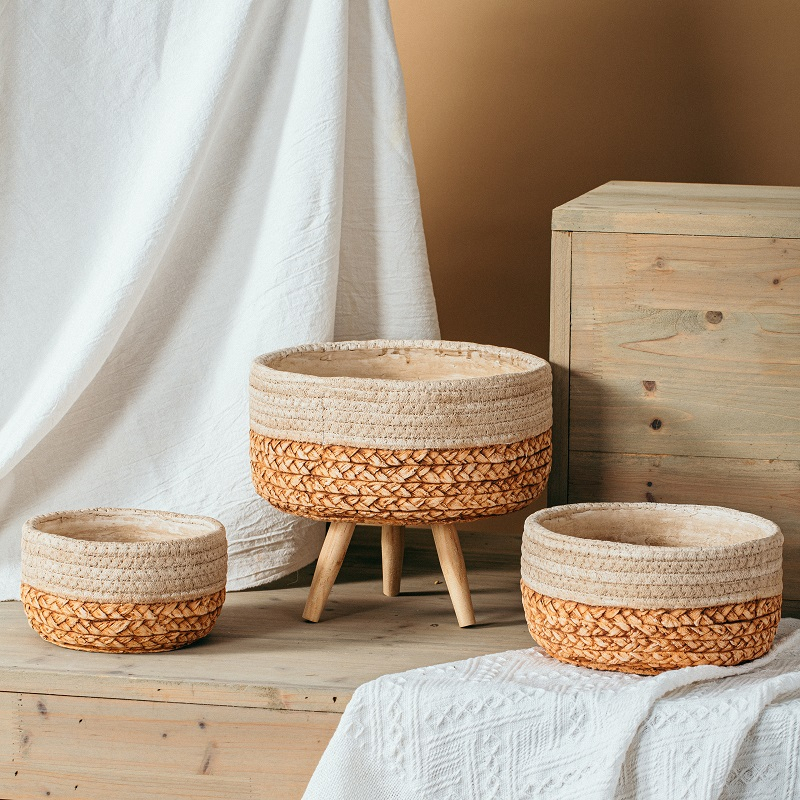 European style home decoration round matte cement flower pots planters bamboo woven design wholesale cement pots