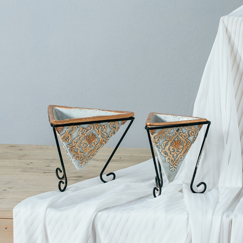 You are here: Home » NEW DEVELOP CEMENT ITEMS » Cement decor » Unique design gold embossed pattern green plants flowerpot balcony cement garden pots with metal stand
