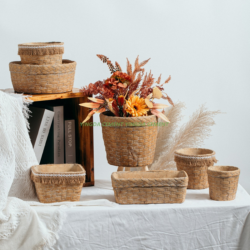Creative rustic pastoral unique woven basket design cement urn pot decoration concrete flower pots planters
